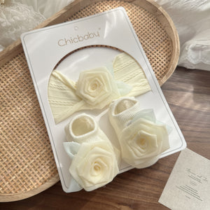 Our Floral Rose Headband & Booties Set features a soft stretch white headband adorned with a delicate 3D rose and matching cozy booties designed with elegant floral detailing.