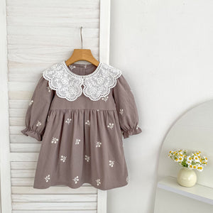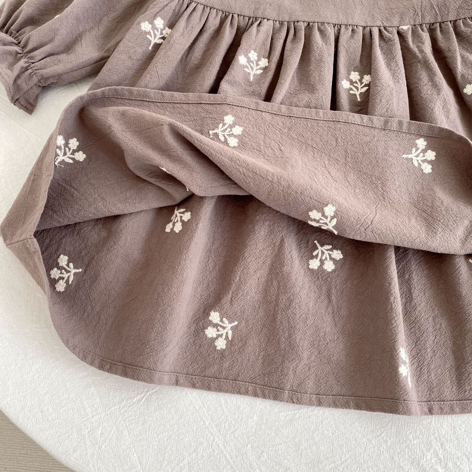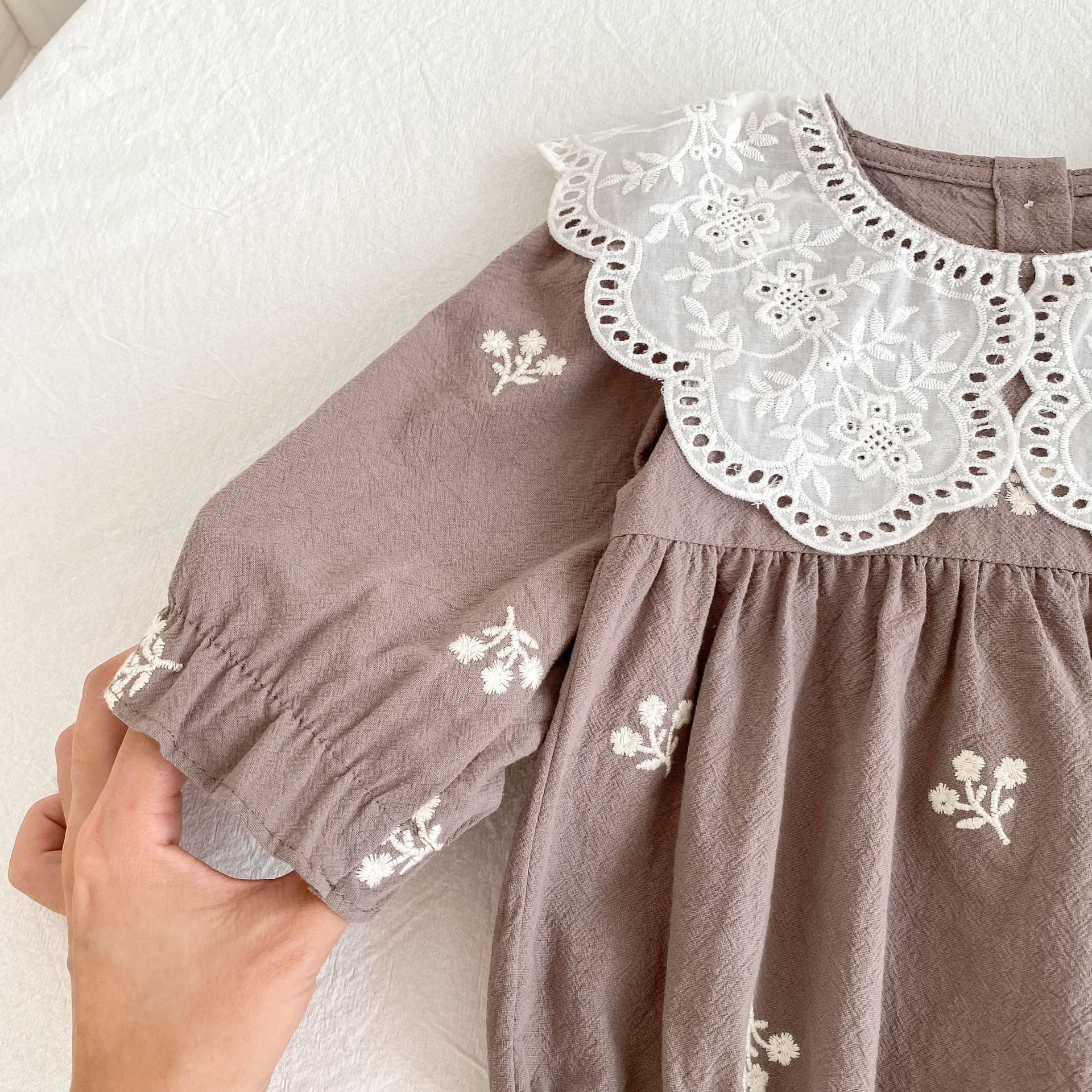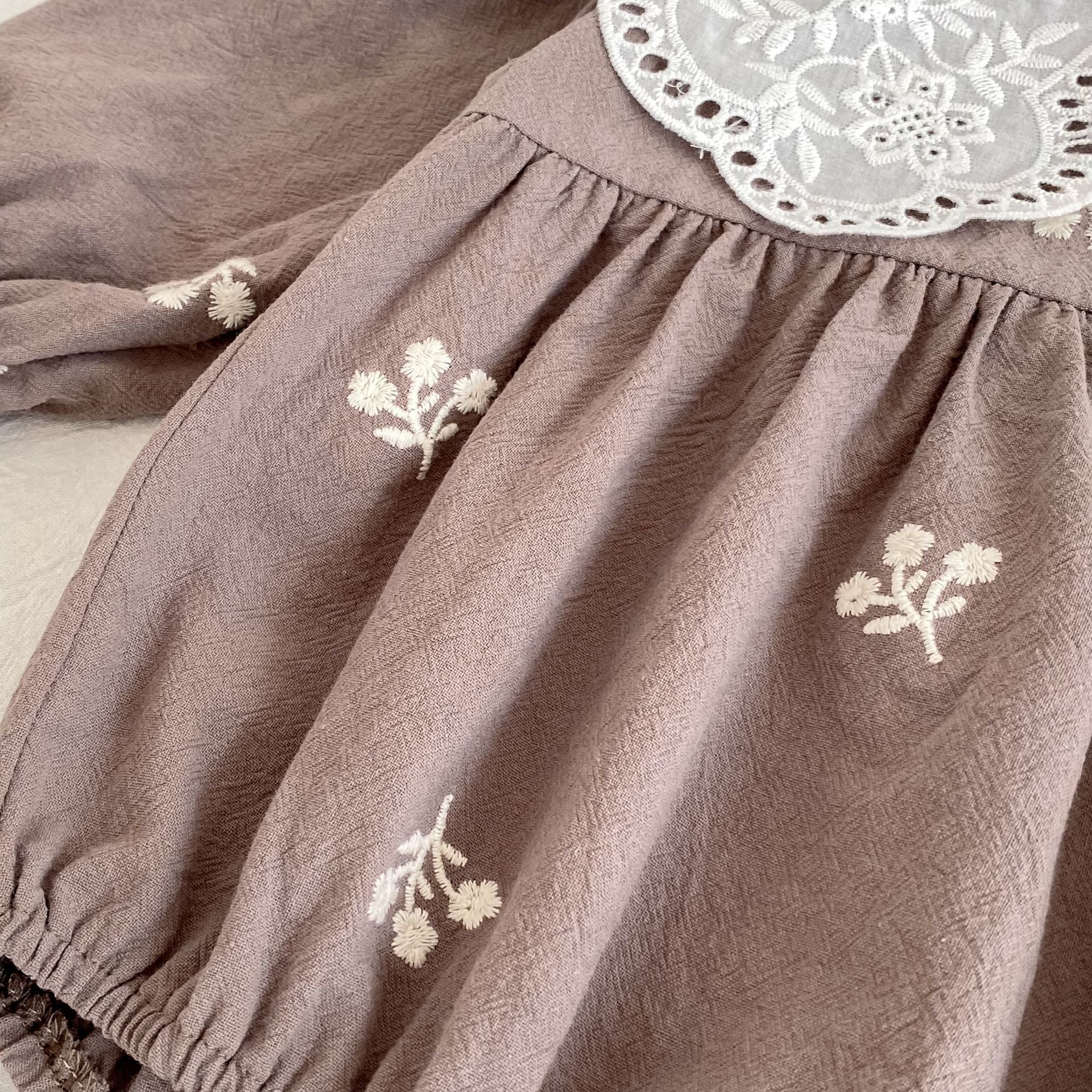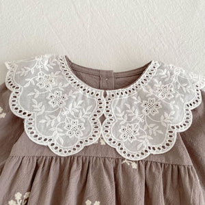 Dress your little angel in timeless elegance with our Mocha Blossom Romper. Crafted from soft breathable cotton, this romper features delicate white floral embroidery and a beautifully scalloped lace collar that adds a charming vintage touch. The gentle crinkle cotton texture feels light on baby skin, making it perfect for all-day comfort.