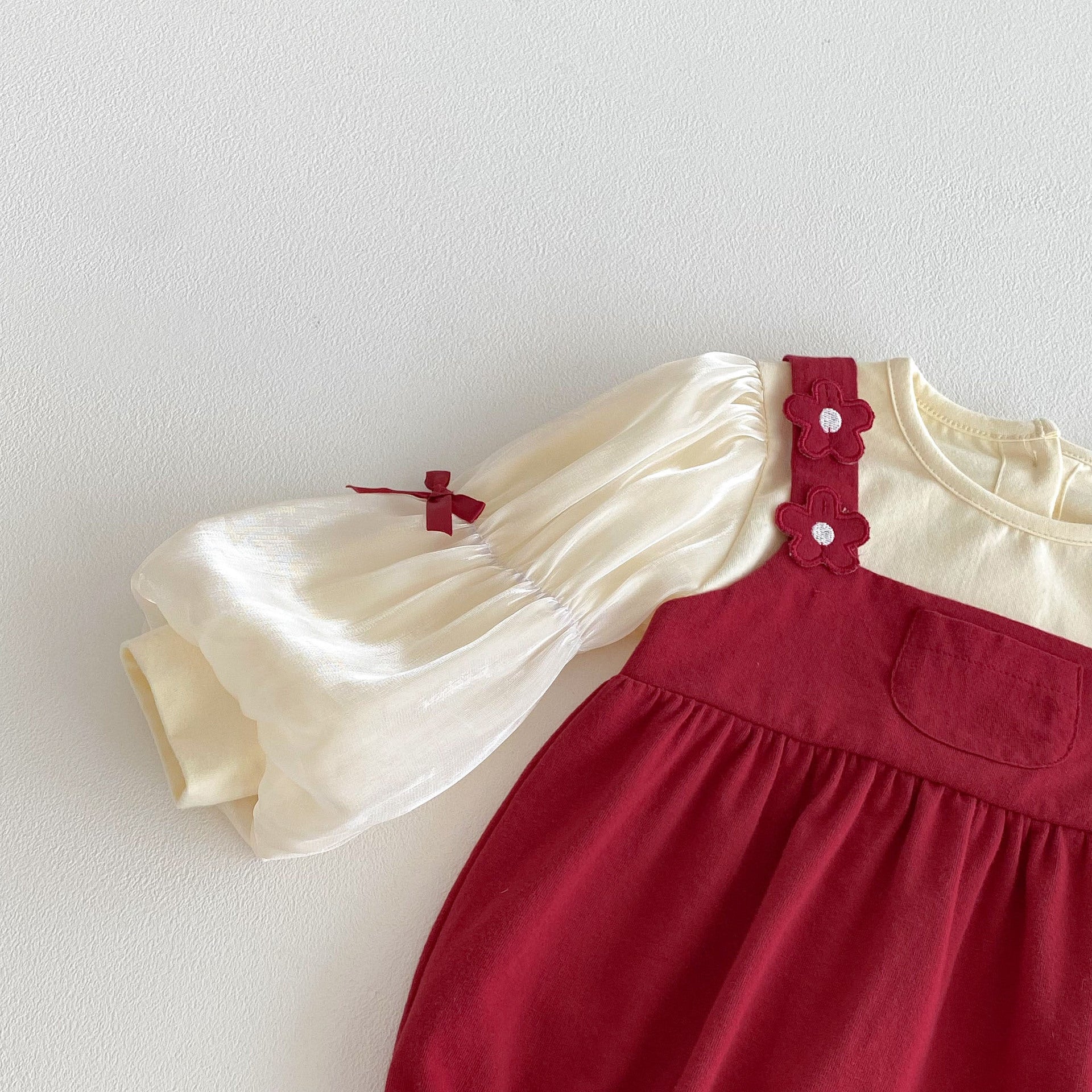 Delicate flower appliquΓ© straps, a cute front pocket, and soft puff sleeves with tiny bow details add extra sweetness to the outfit. The breathable cotton fabric keeps your baby comfortable all day, while snap buttons at the bottom make diaper changes easy and hassle-free.