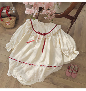 Our Vintage Cream Lace Dress is designed for little girls who love classic boutique style. Featuring delicate lace trims and a bold red ribbon accent, this dress blends tradition with modern elegance.